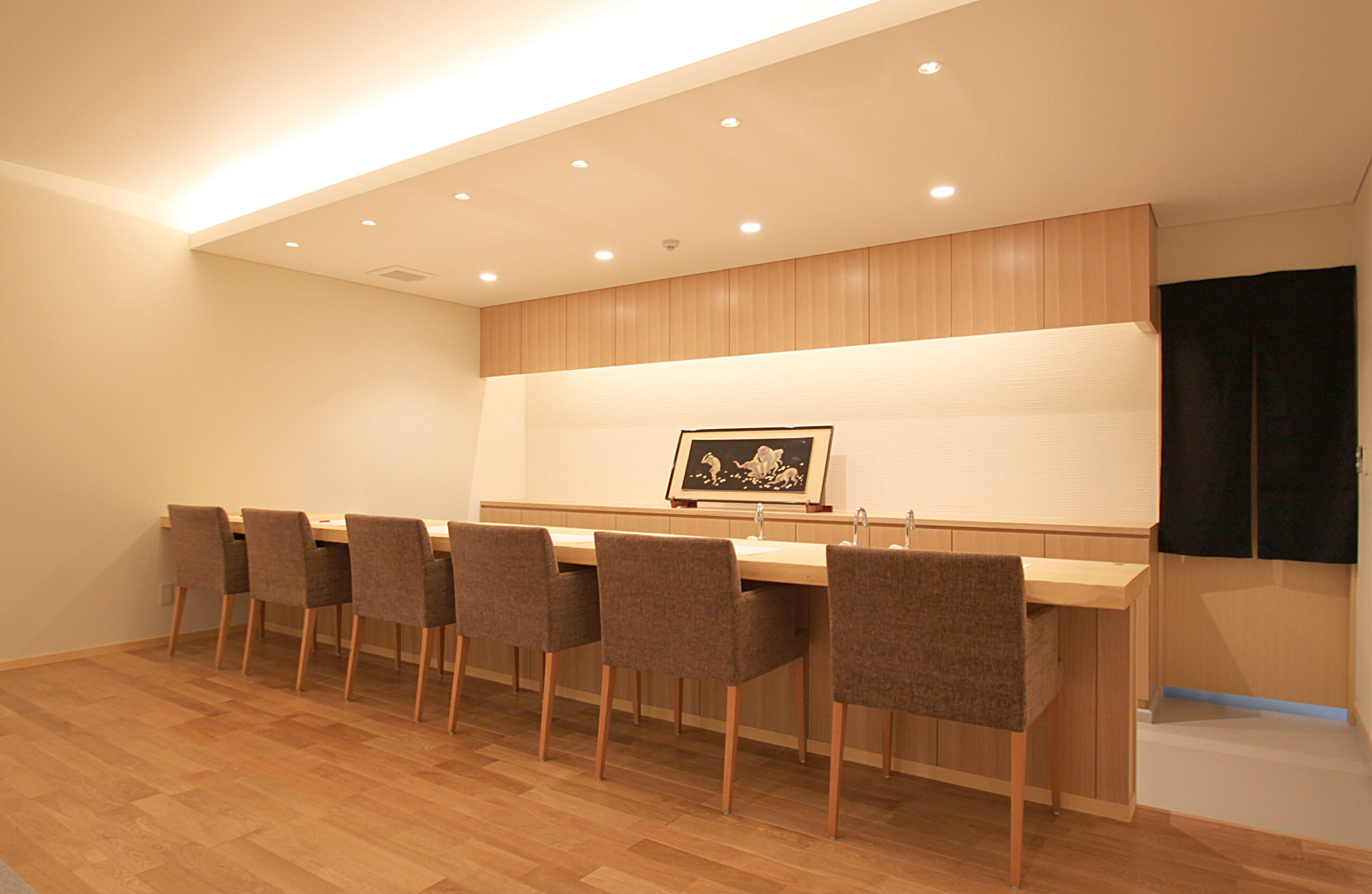 一階を全面改修しカウンター席を新しく計画しました。落ち着いた空間でゆっくりとお料理を楽しめるよう、外部からは隠れ家のようで玄関ホールからは新しいかつきの顔となるような空間を目指しました。
